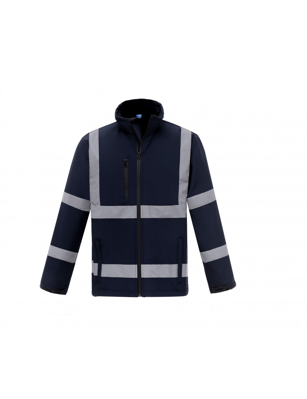 Giacca softshell ad alta visibilità. Questo modello ha 3 strati. Un primo strato impermeabile di 8000 mm. Uno strato interno in microfibra. Lo strato esterno ha 2 strisce verticali, 2 strisce orizzontali riflettenti cucite 5 cm e 2 strisce riflettenti sulle maniche. Le cerniere sono impermeabili. Ha 2 tasche frontali. La vita è regolabile con coulisse. I polsini sono anche regolabili. I colori arancione ad alta visibilità, giallo ad alta visibilità, giallo ad alta visibilità / blu scuro e arancione ad alta visibilità / blu scuro sono conformi alla norma EN ISO20471: 2013 Classe 3. Anche i colori ad alta visibilità arancione e blu scuro con le specifiche GO / RT 3279.